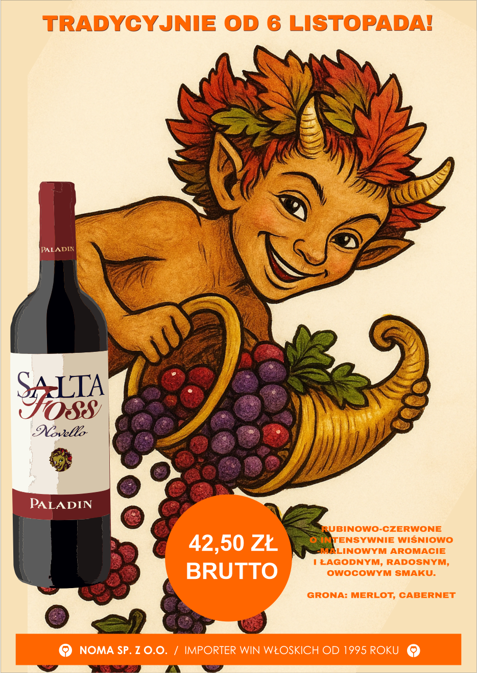 Jak co roku, w pierwszych dniach listopada mamy przyjemność zaprezentować Państwu niezwykle przyjemne młode wino Novello. Spośród wielu wybraliśmy naszym zdaniem najlepsze. Duch wina to wesoły, figlarny SALTA FOSS. Karmi się słońcem i gwiazdami, by móc jako pierwszy zgłębić tajemnicę młodego wina. Rubinowo-czerwone z fioletowymi refleksami. Bukiet pełen świeżości, charakterystyczny i niepowtarzalny, intensywnie owocowy, z nutami leśnych owoców. W smaku łagodnie wytrawne, harmonijne, radosne. Urzeka swoją miękkością.